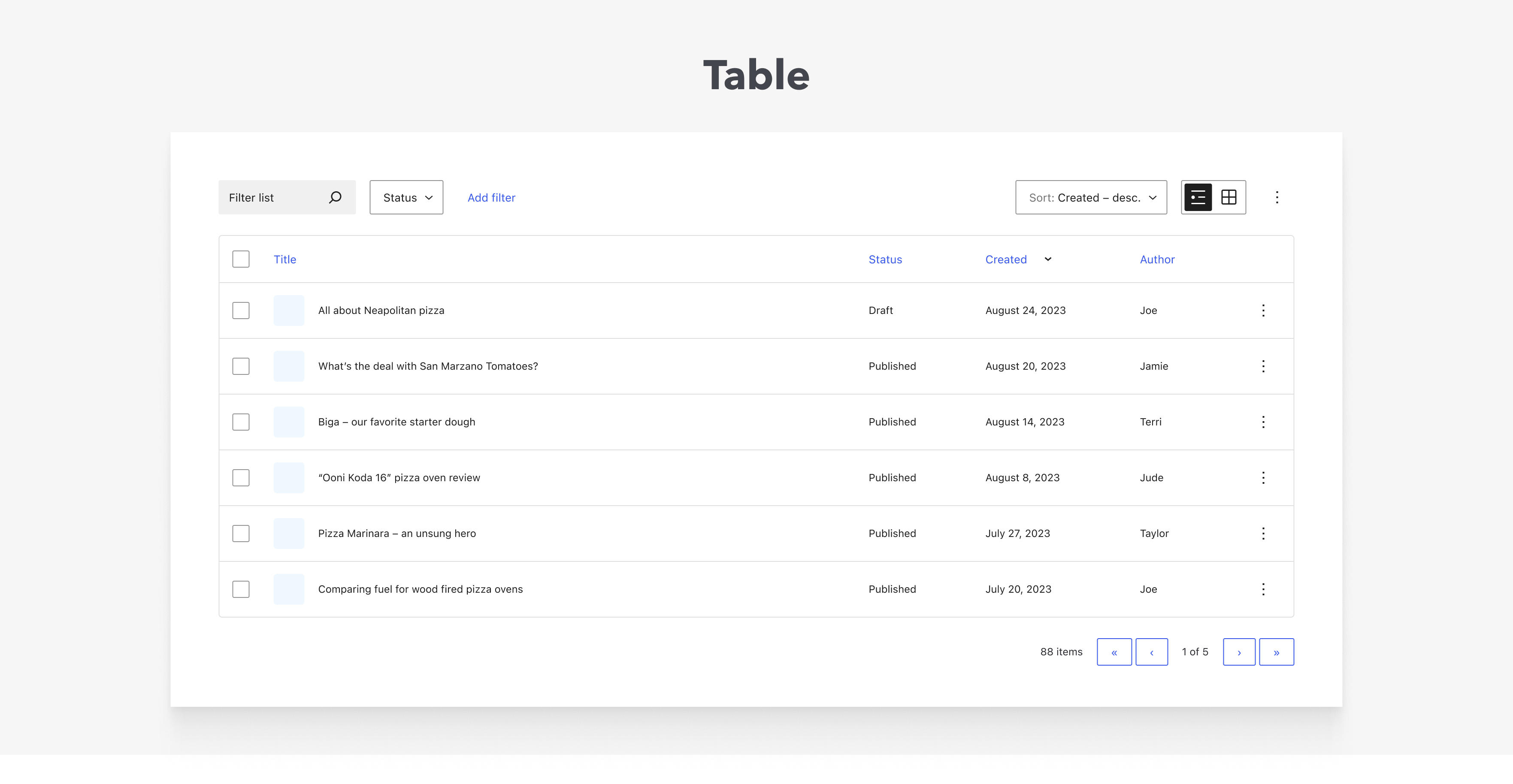 First round of designs for an enhanced table component with features like filtering, view options, column options, bulk actions, and quick edits. Issue.