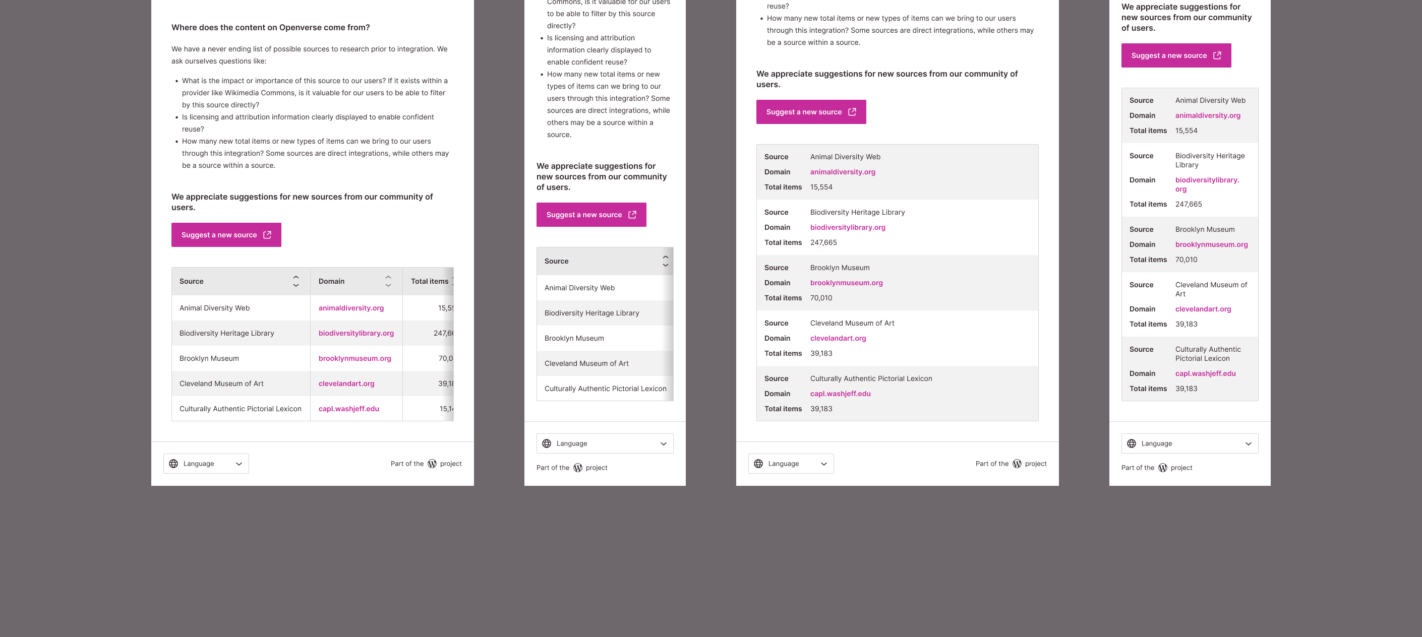As a minor improvement, we explored an idea for the responsive style of the table in Openverseโs source page. The design is subtle and proposes stacking rows to keep all information on the page without additional scrollbars and interactions.