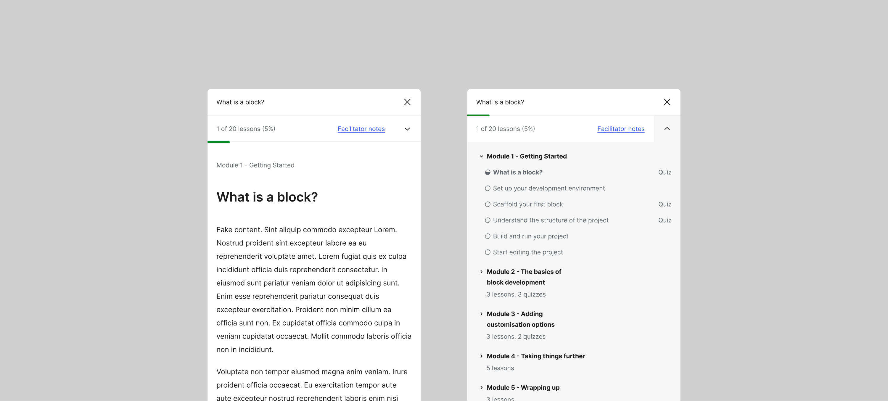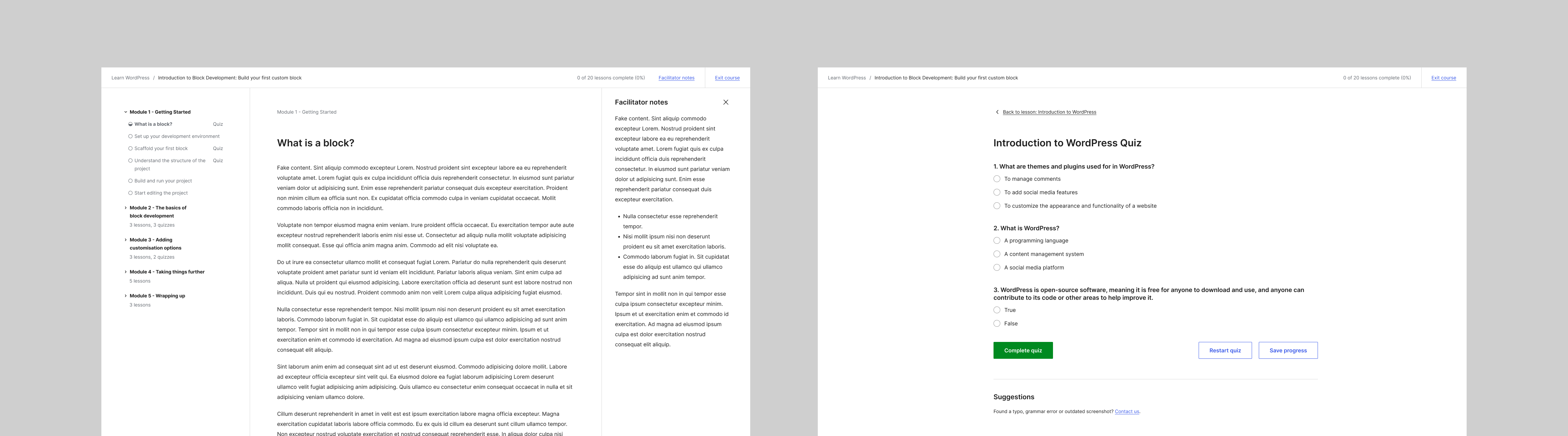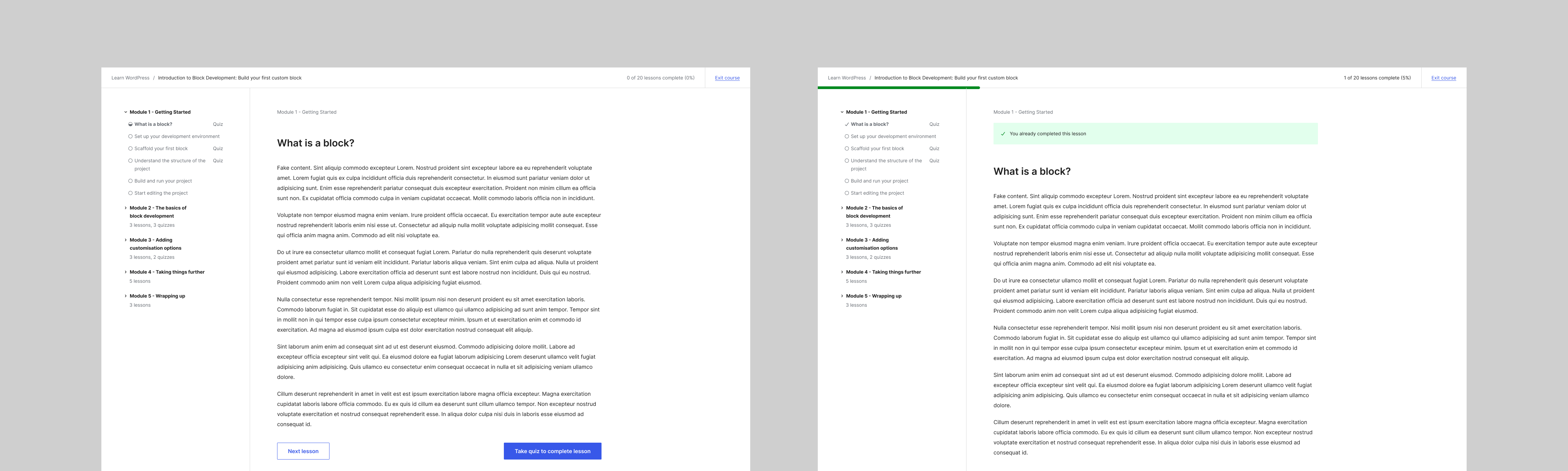 As part of the Learn redesign, we dedicated time to revisit the learning flows of Lessons and revamp the UI. Driven by the content needs and bugs reported during the last few days, we worked on a design that taps into existing components and improves the consistency with the WordPress.org site.