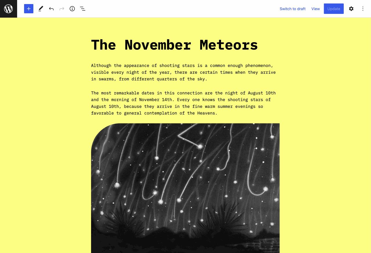 The visual appearance of selecting text and blocks has been updated to be clearer. Partial selections remain the native indicator, but when the selection starts to include a blockBlockBlock is the abstract term used to describe units of markup that, composed together, form the content or layout of a webpage using the WordPress editor. The idea combines concepts of what in the past may have achieved with shortcodes, custom HTML, and embed discovery into a single consistent API and user experience. that canโt be merged, the multi-selection now shows an overlay color across every block selected.
